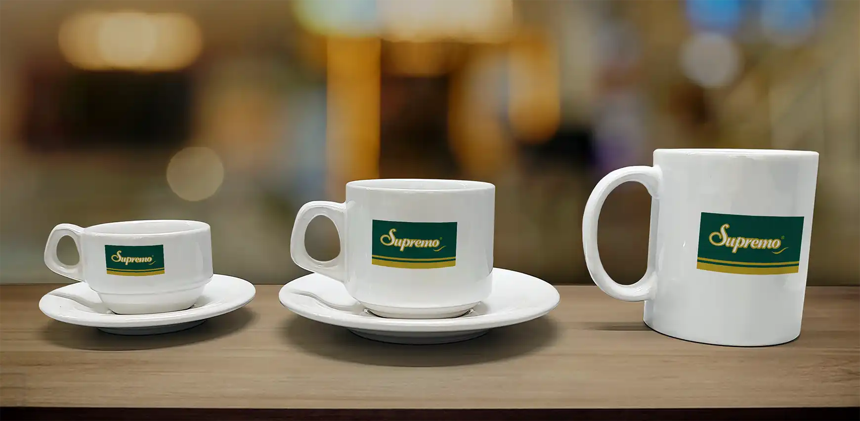 A Supremo conta com xícaras e canecas de porcelana que podem ser personalizadas com o arte do cliente.